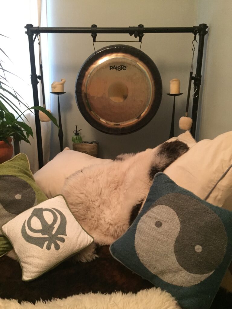 The gong’s sound gently reverberates over, around and through the entire body to calm, relax and soothe.